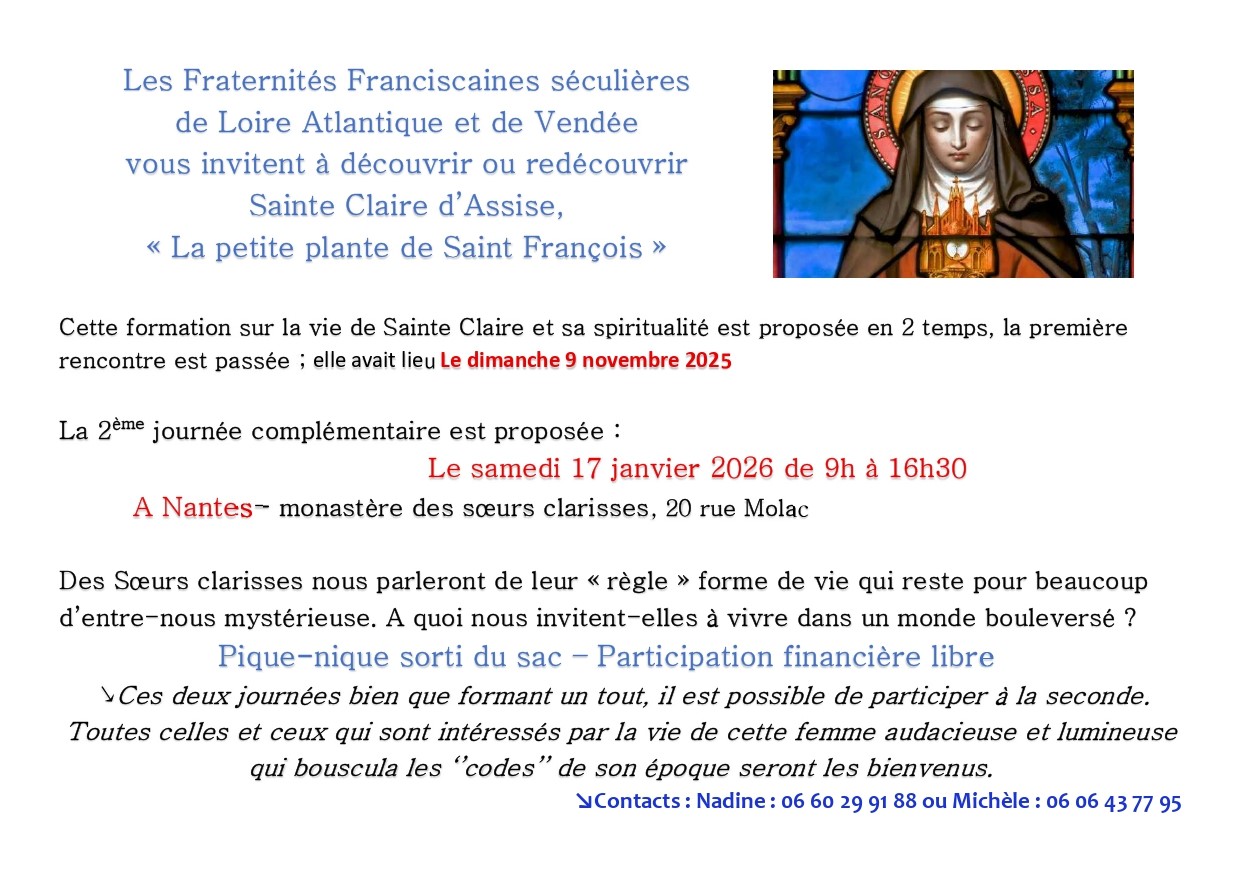 Le samedi 17 janvier 2026 (de 9 h à 16 h 30), les sœurs Clarisses de Nantes compléteront cette formation sur la vie et la spiritualité de Sainte Claire d’Assise, cette femme audacieuse et lumineuse – dans leur monastère (20 rue Molac).